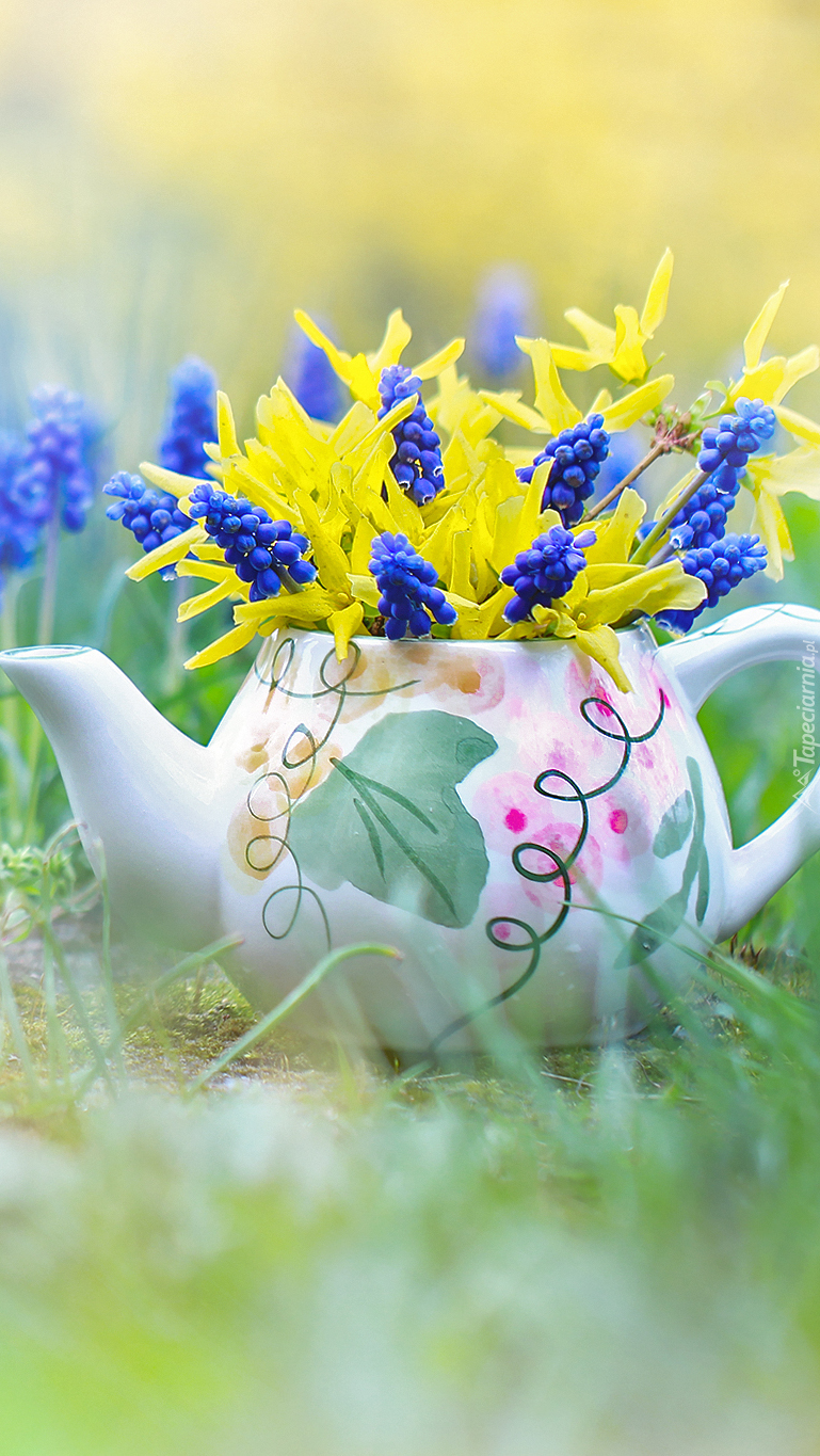 Edytor tapety: Forsycje i szafirki w dzbanuszku