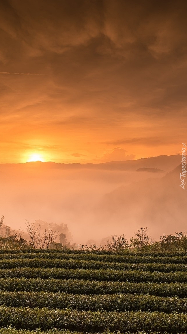 Edytor tapety: Wschód słońca nad zamglonym polem