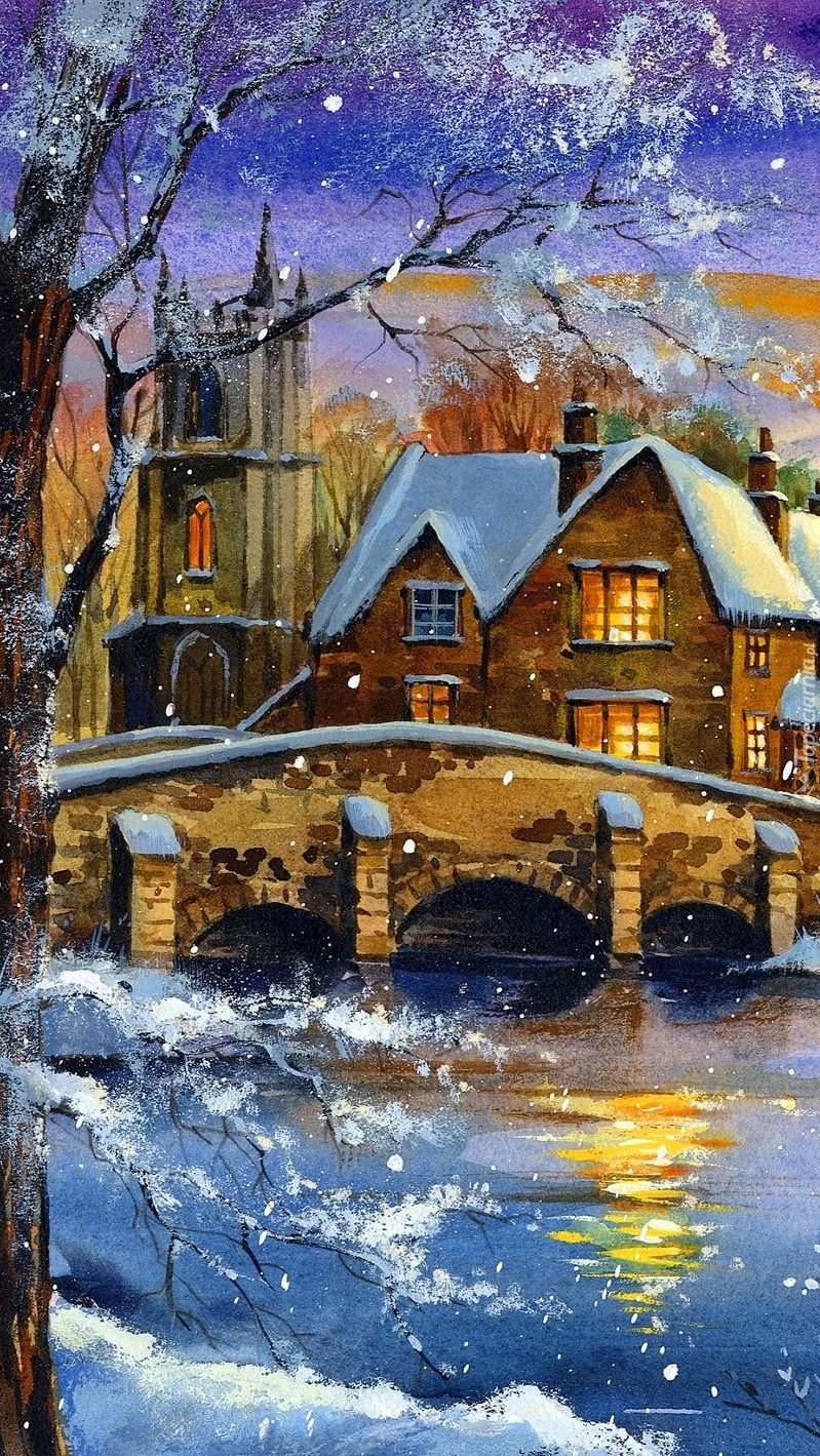 Edytor tapety: Ośnieżony domek nad strumykiem