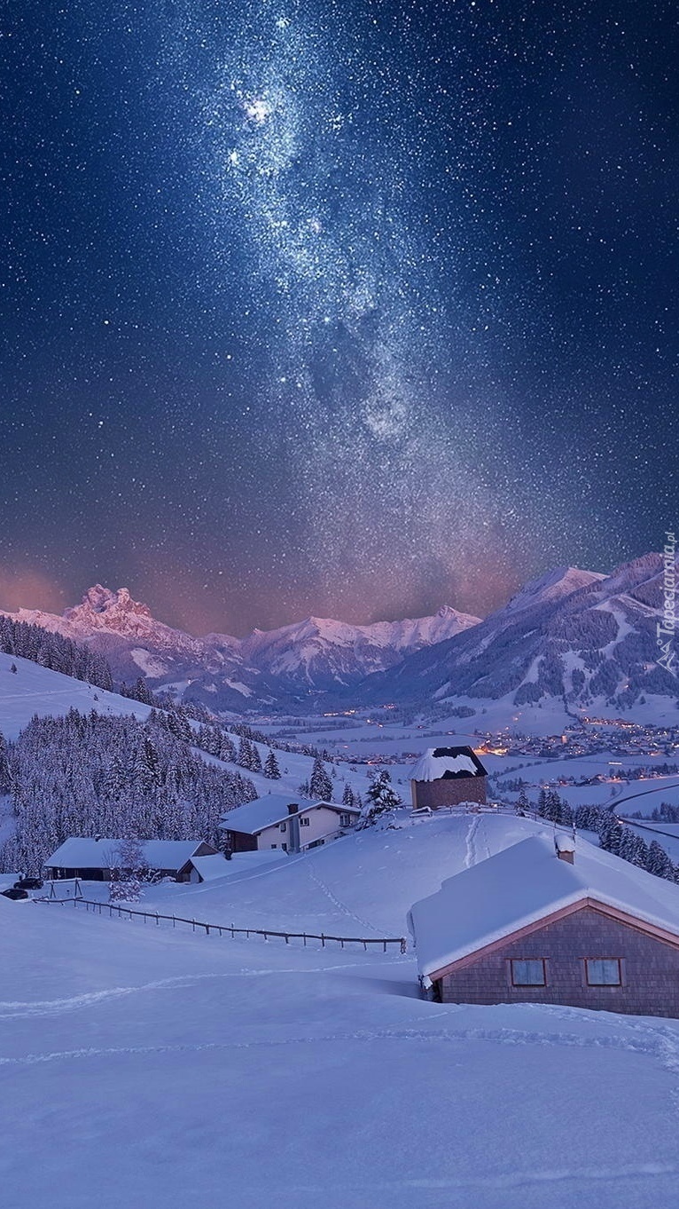 Edytor tapety: Domy w górach zimową nocą