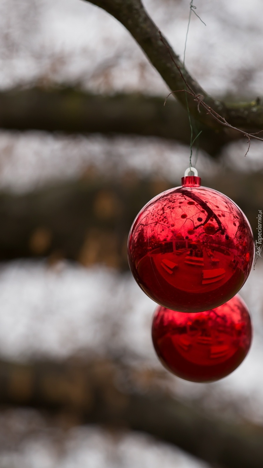 Edytor tapety: Dwie czerwone bombki na drzewie