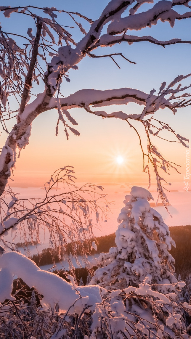 Edytor tapety: Ośnieżone drzewa w promieniach słońca