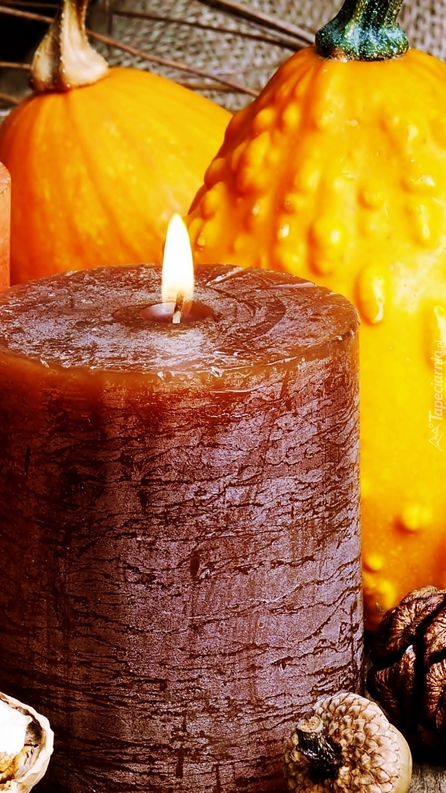 Edytor tapety: Zapalona świeca obok dyń