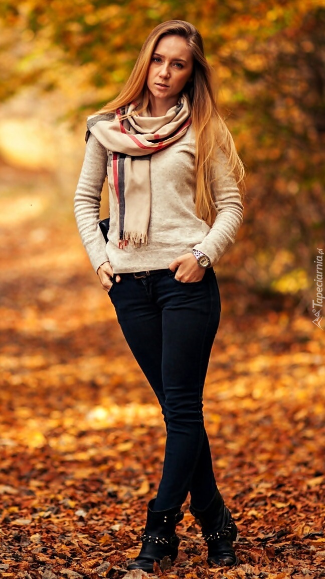 Edytor tapety: Dziewczyna w szaliku na jesiennej drodze