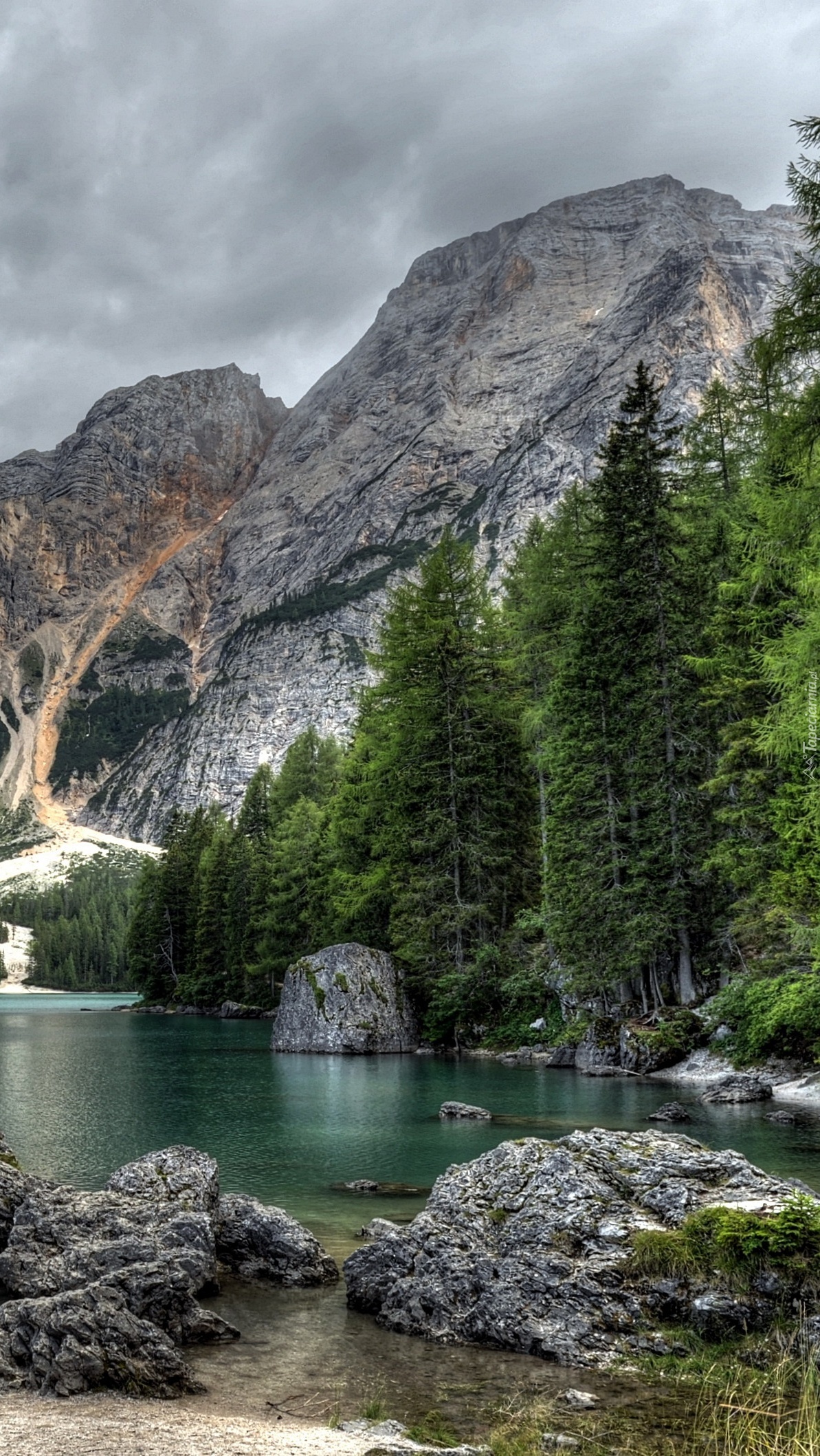 Edytor tapety: Pochmurne niebo nad górskim jeziorem