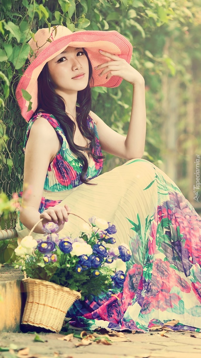 Edytor tapety: Kobieta w kapeluszu i kwiecistej sukience