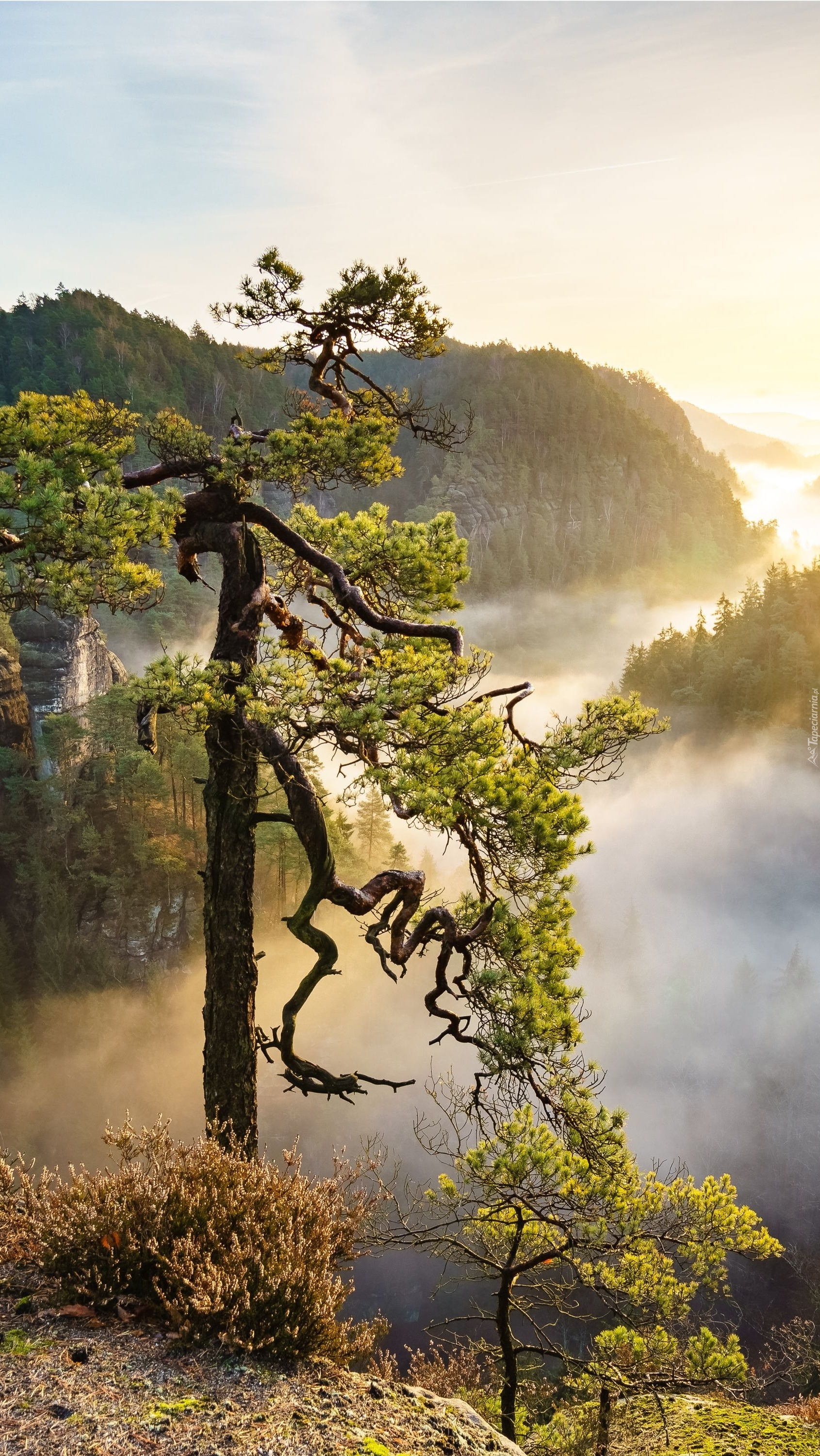 Edytor tapety: Drzewo w górach o wschodzie słońca