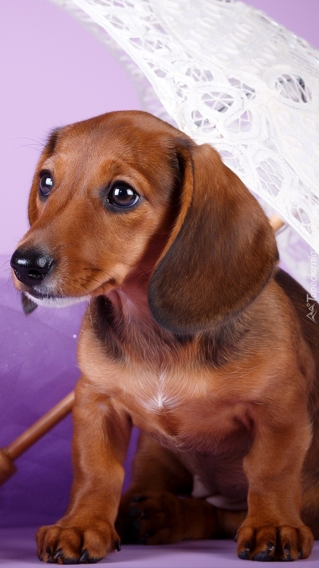 Edytor tapety: Jamnik krótkowłosy pod parasolką