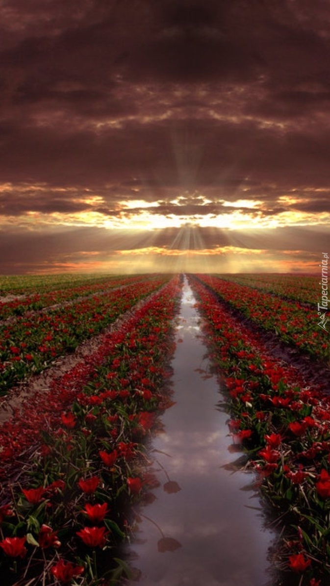 Edytor tapety: Promienie zachodzącego słońca nad polem tulipanów
