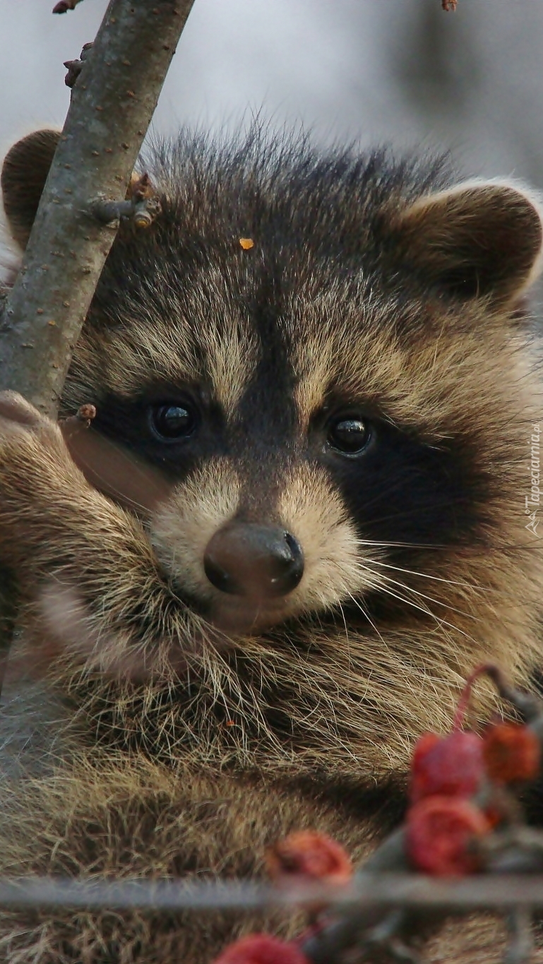 Edytor tapety: Szop trzyma się gałęzi