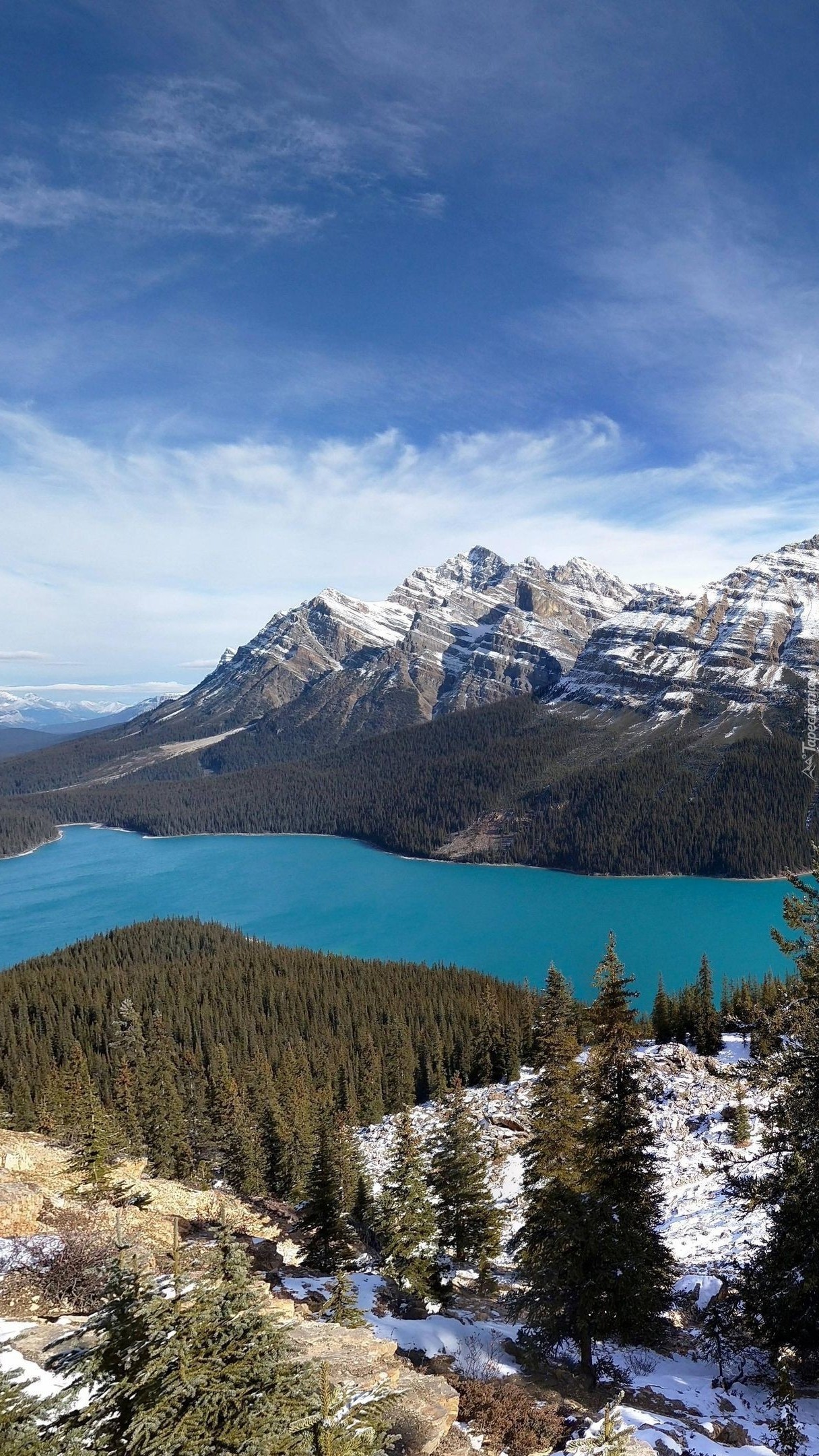 Edytor tapety: Ośnieżone szczyty gór i leśne jezioro