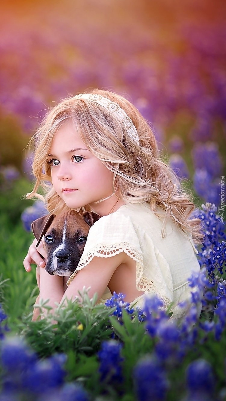 Edytor tapety: Dziewczynka z bokserem na łubinowej łące