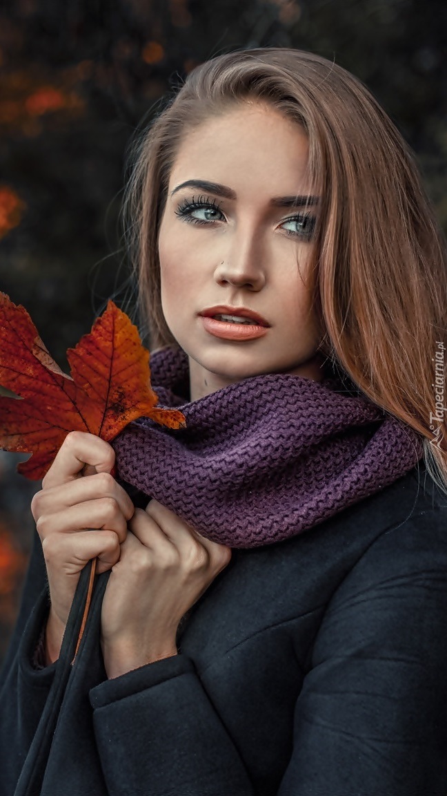 Edytor tapety: Dziewczyna z liściem w dłoni jesienią