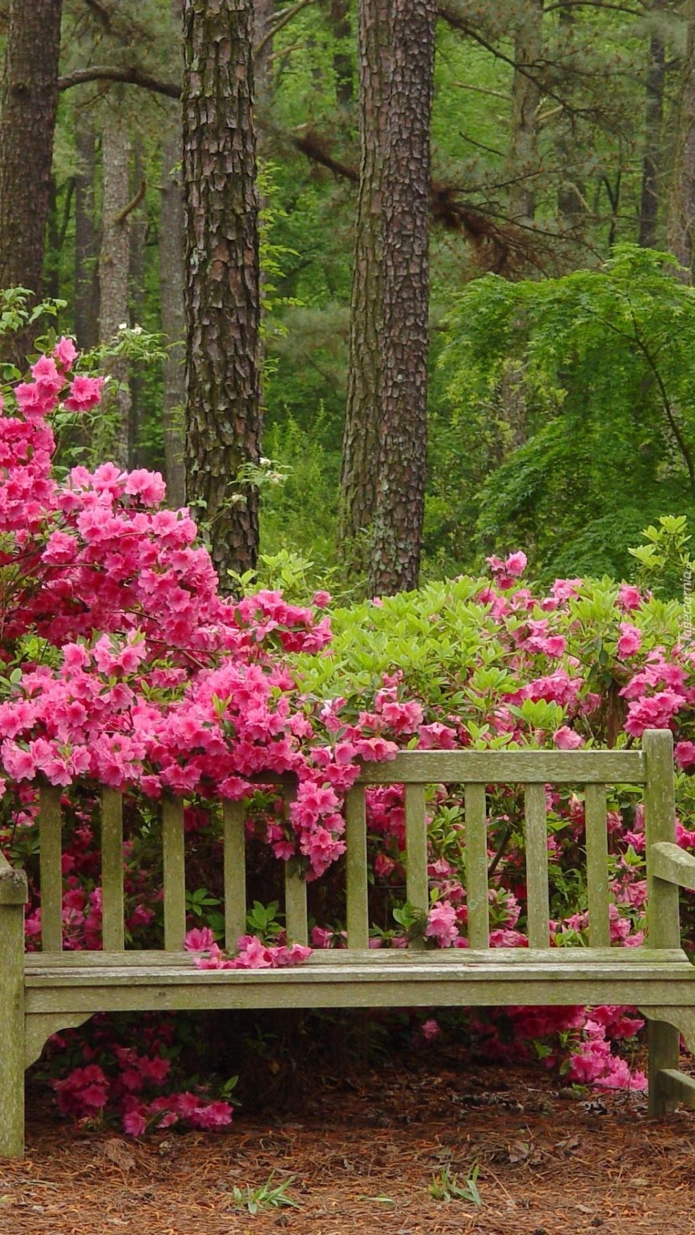 Edytor tapety: Ławeczka wśród kwitnących krzewów