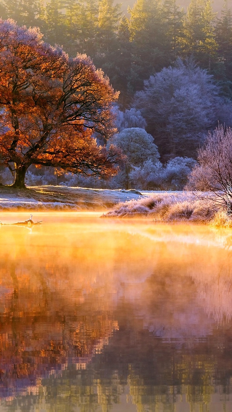 Edytor tapety: Oszronione drzewa odbijające się w jeziorze