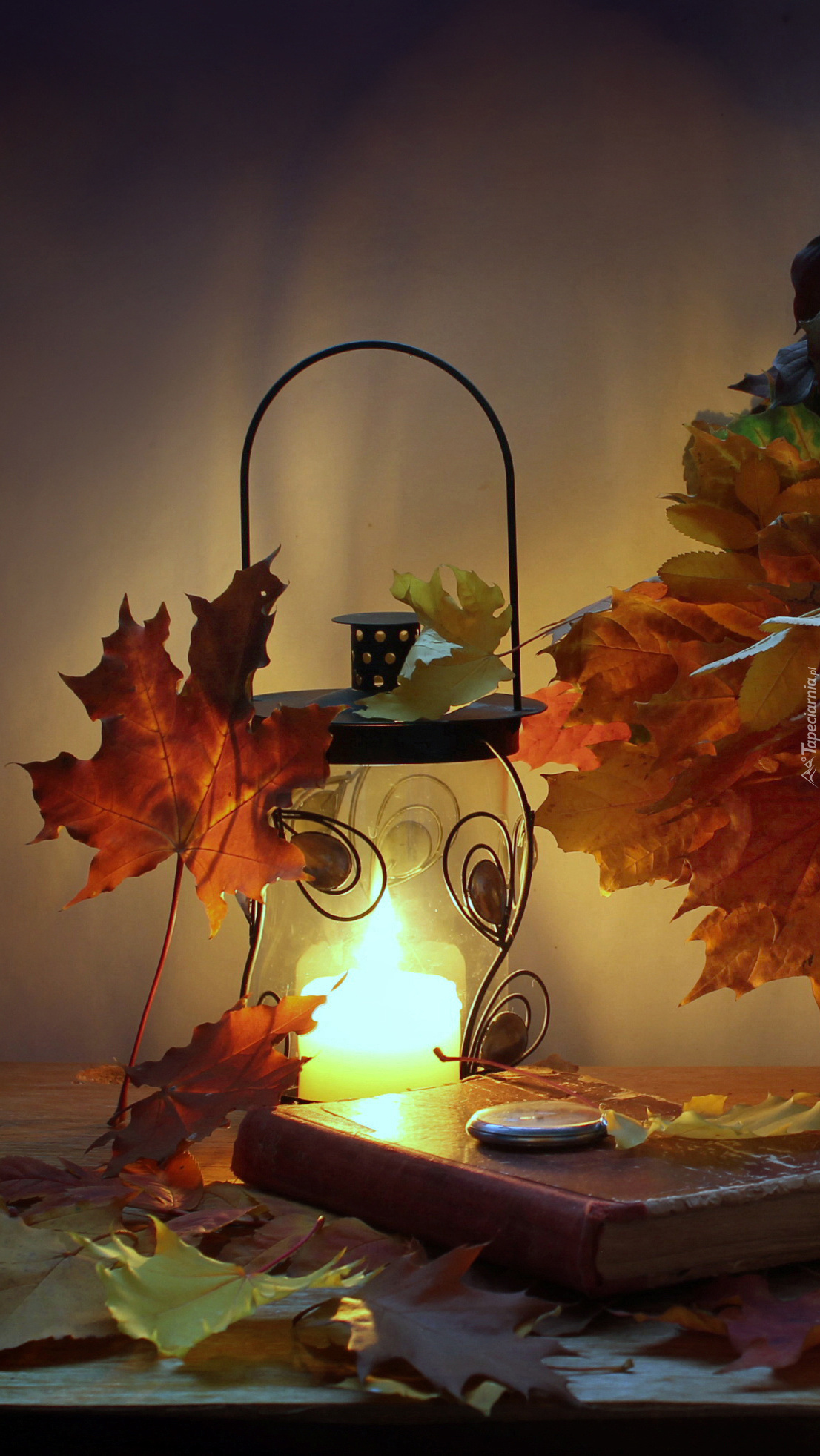 Edytor tapety: Latarenka ze świecą w jesiennych liściach
