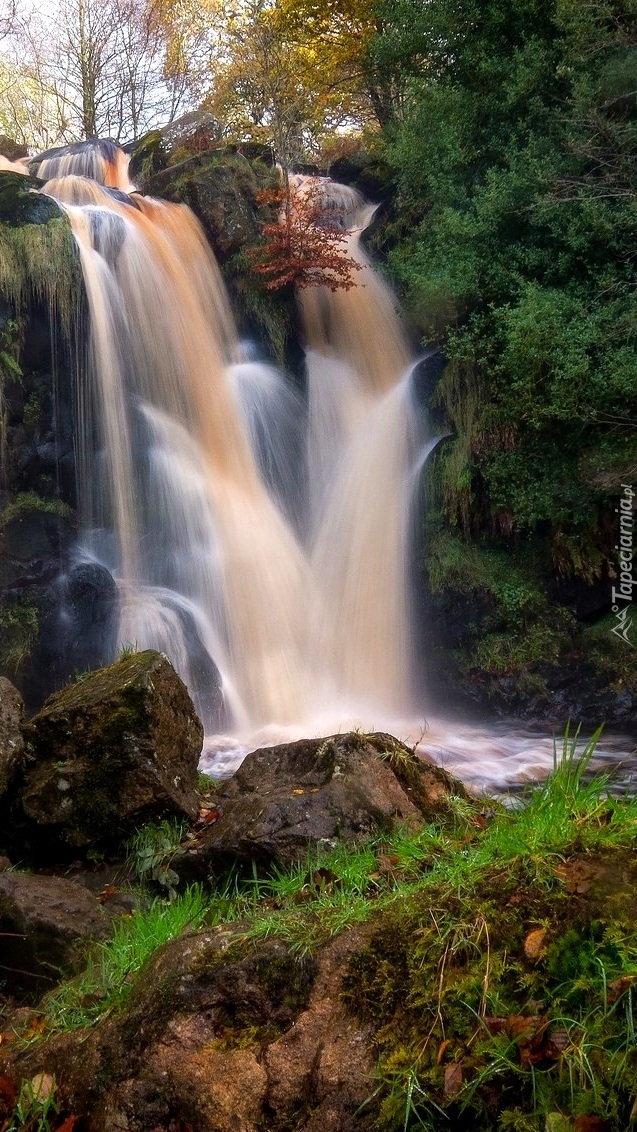 Edytor tapety: Skalny leśny wodospad w zieleni