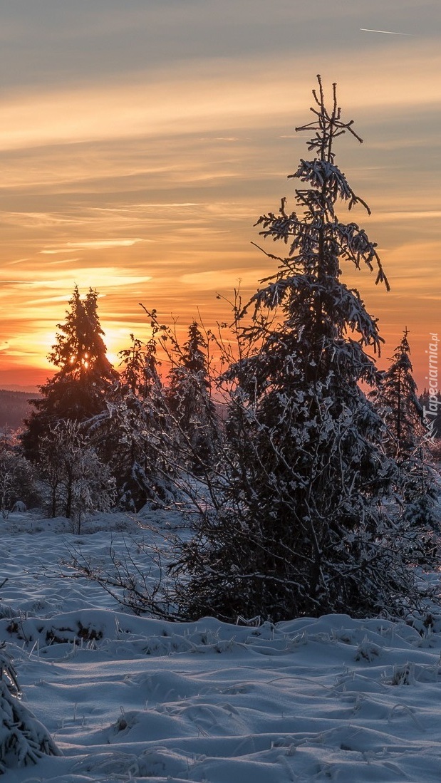 Edytor tapety: Ośnieżone świerki o zachodzie słońca