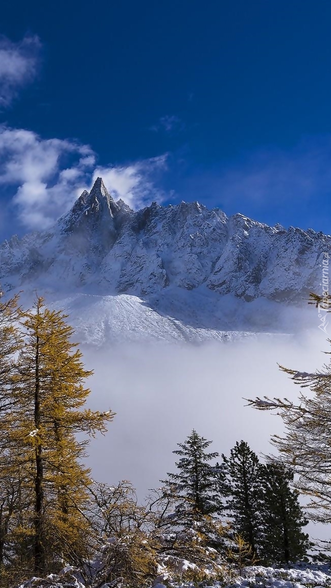 Edytor tapety: Wierzchołki drzew na tle zamglonych gór