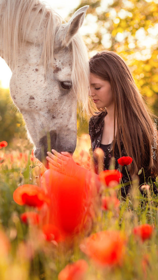 Edytor tapety: Dziewczyna z koniem na makowej łące