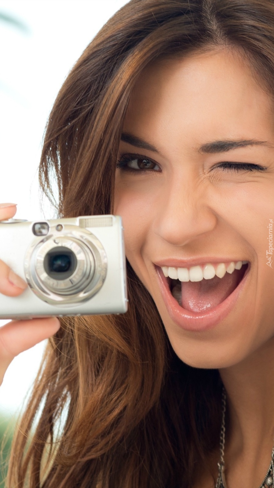 Edytor tapety: Uśmiechnięta szatynka z aparatem fotograficznym