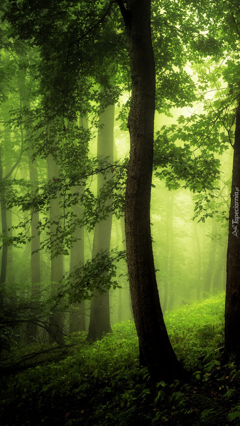 Edytor tapety: Zielony las we mgle