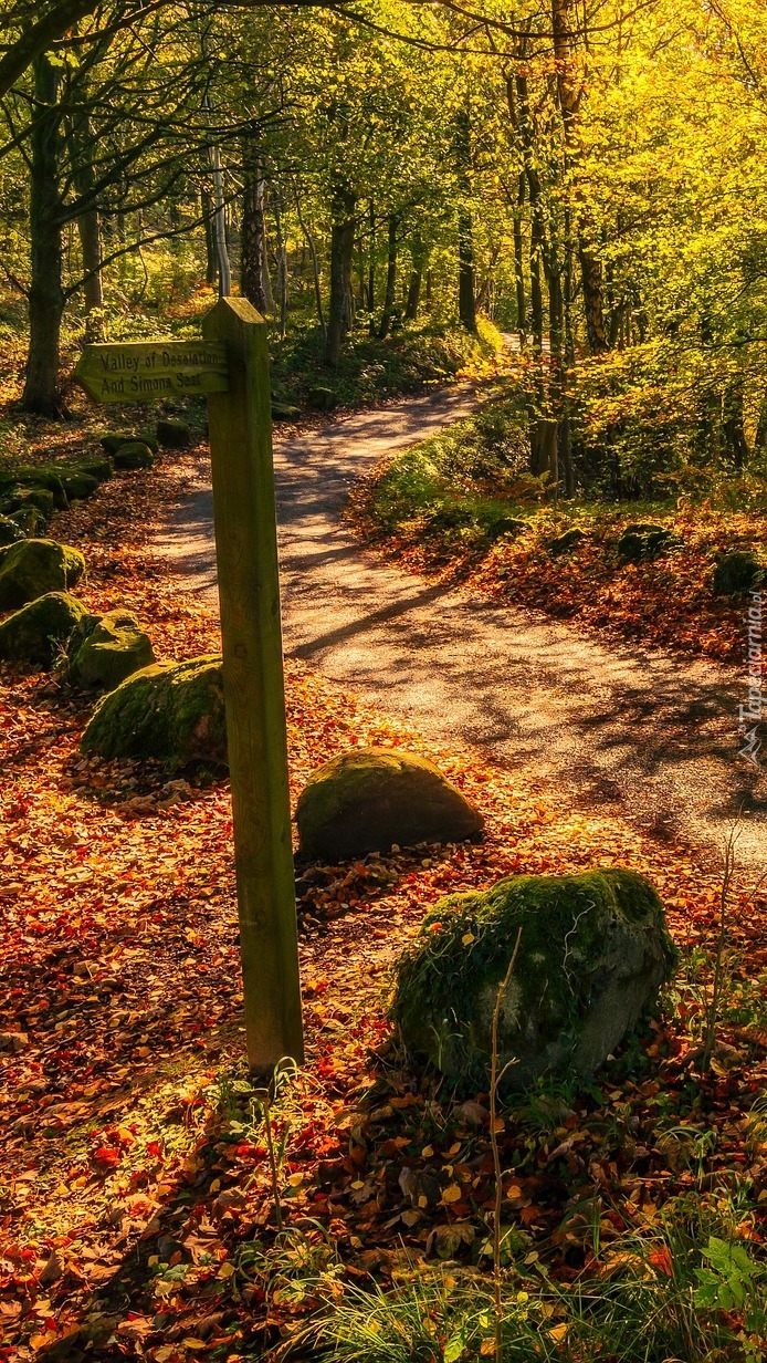 Edytor tapety: Leśna jesienna droga z omszałymi kamieniami