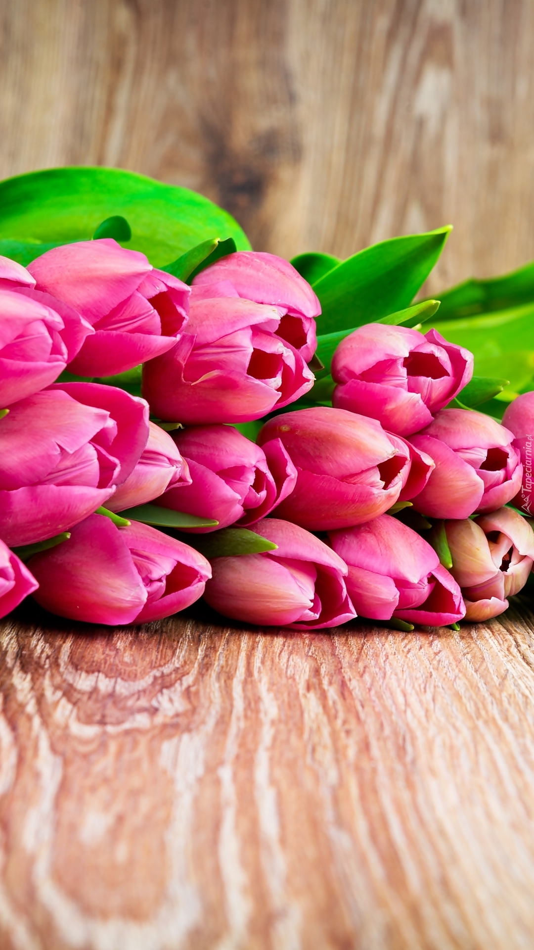 Edytor tapety: Bukiet różowych tulipanów na deskach
