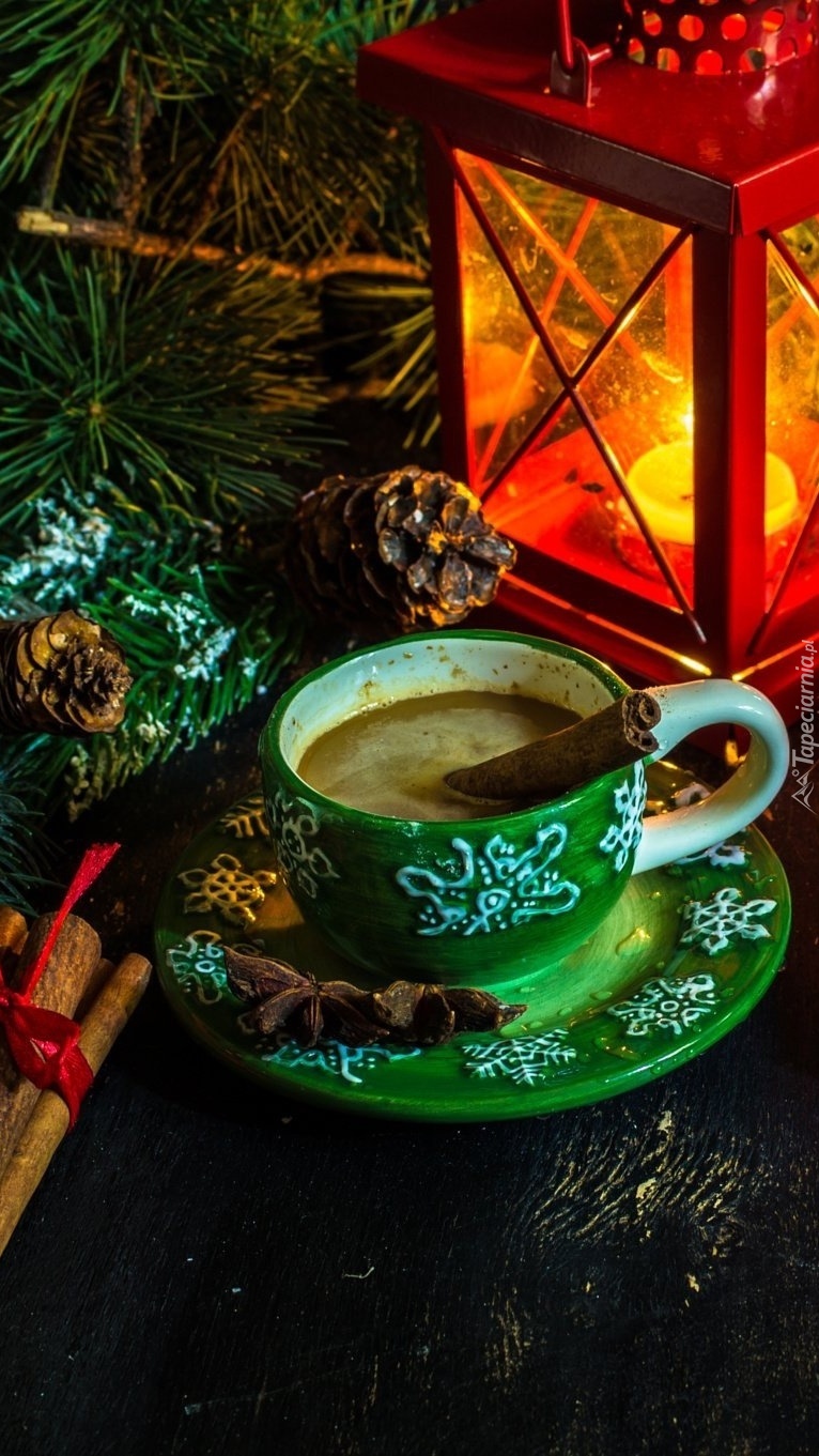 Edytor tapety: Filiżanka kawy z cynamonem obok lampionu