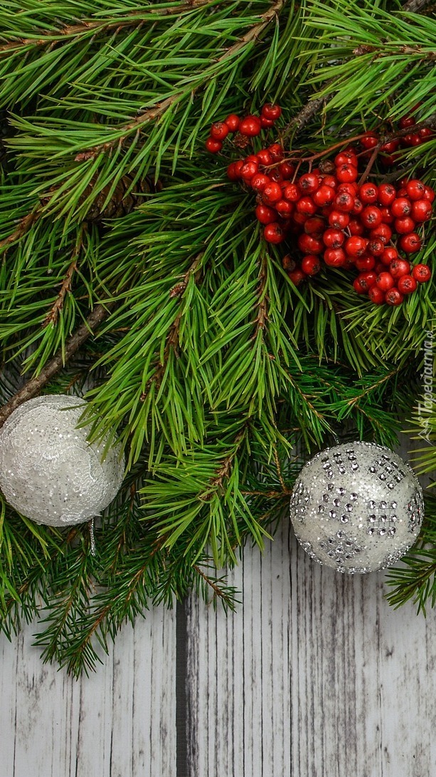 Edytor tapety: Gałązki przystrojone bombkami i jarzębiną