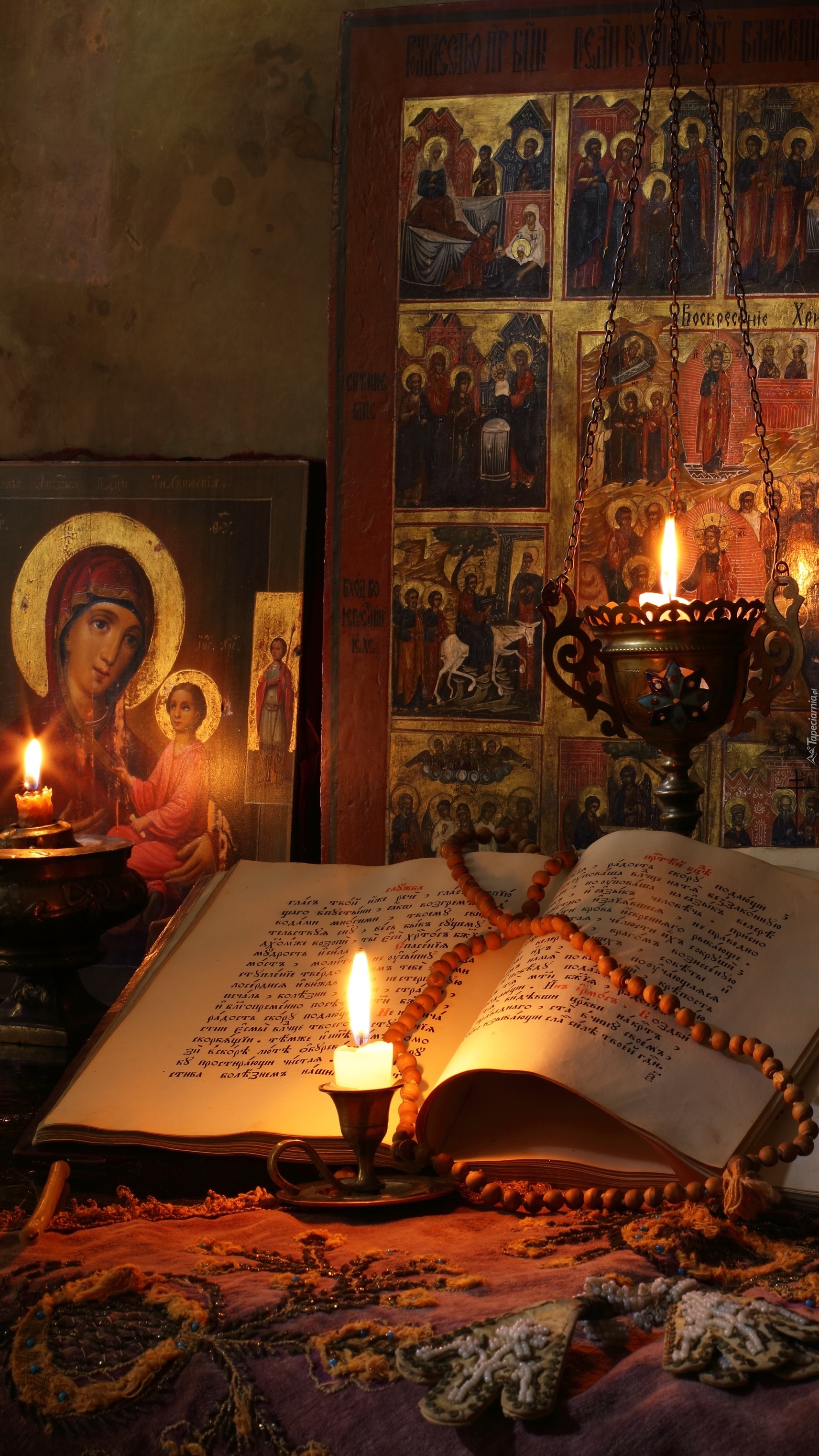 Edytor tapety: Ikony i księga w świetle świec