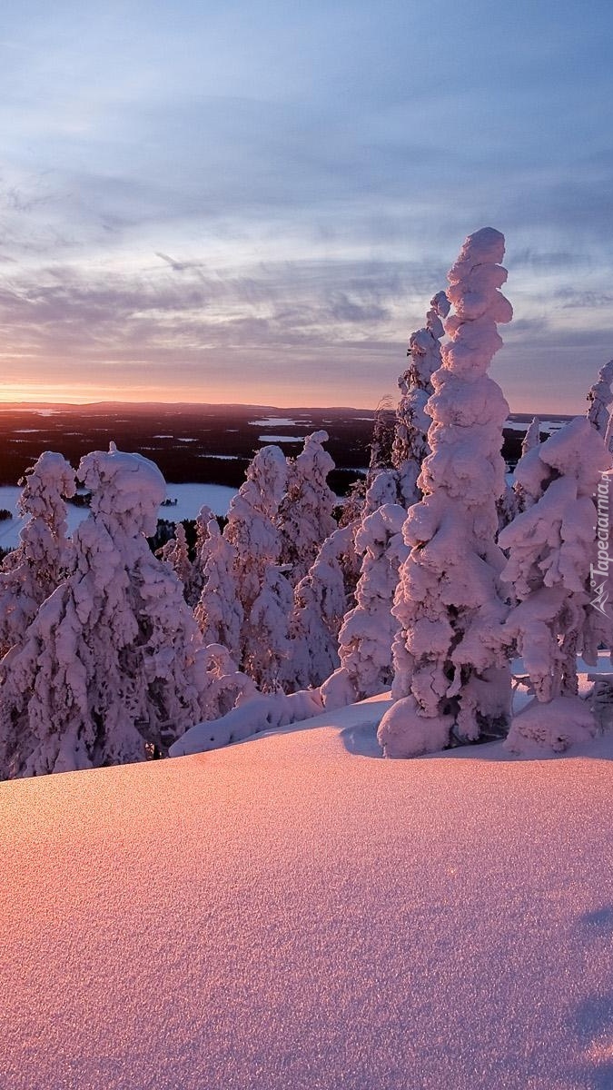 Edytor tapety: Ośnieżone drzewa o zachodzie słońca