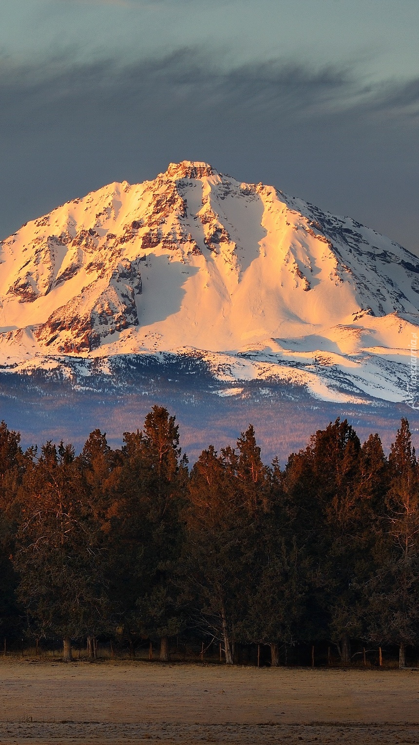 Edytor tapety: Las z ośnieżonymi górami w tle