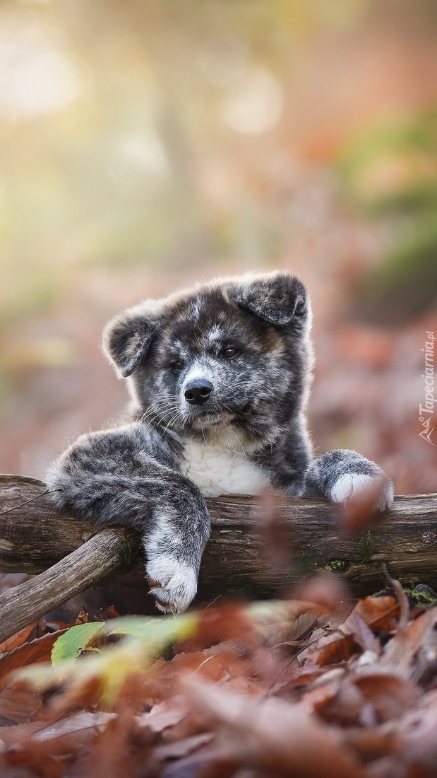 Edytor tapety: Szczeniak akita oparty o pień drzewa