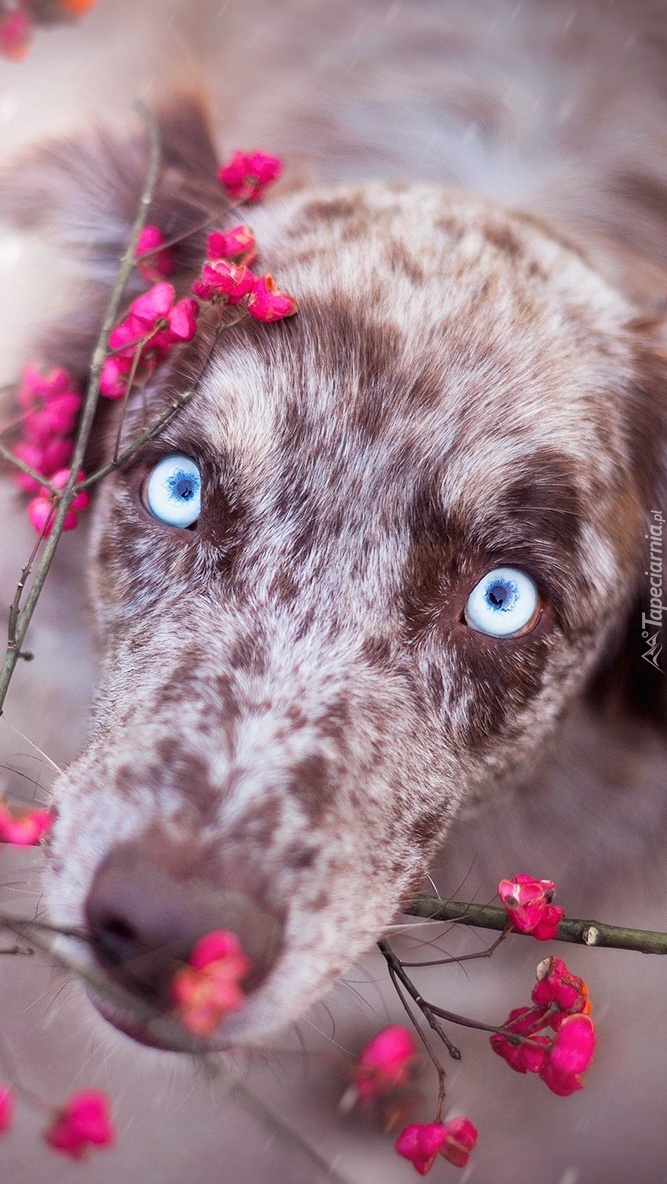 Edytor tapety: Owczarek australijski z gałązkami kwiatów