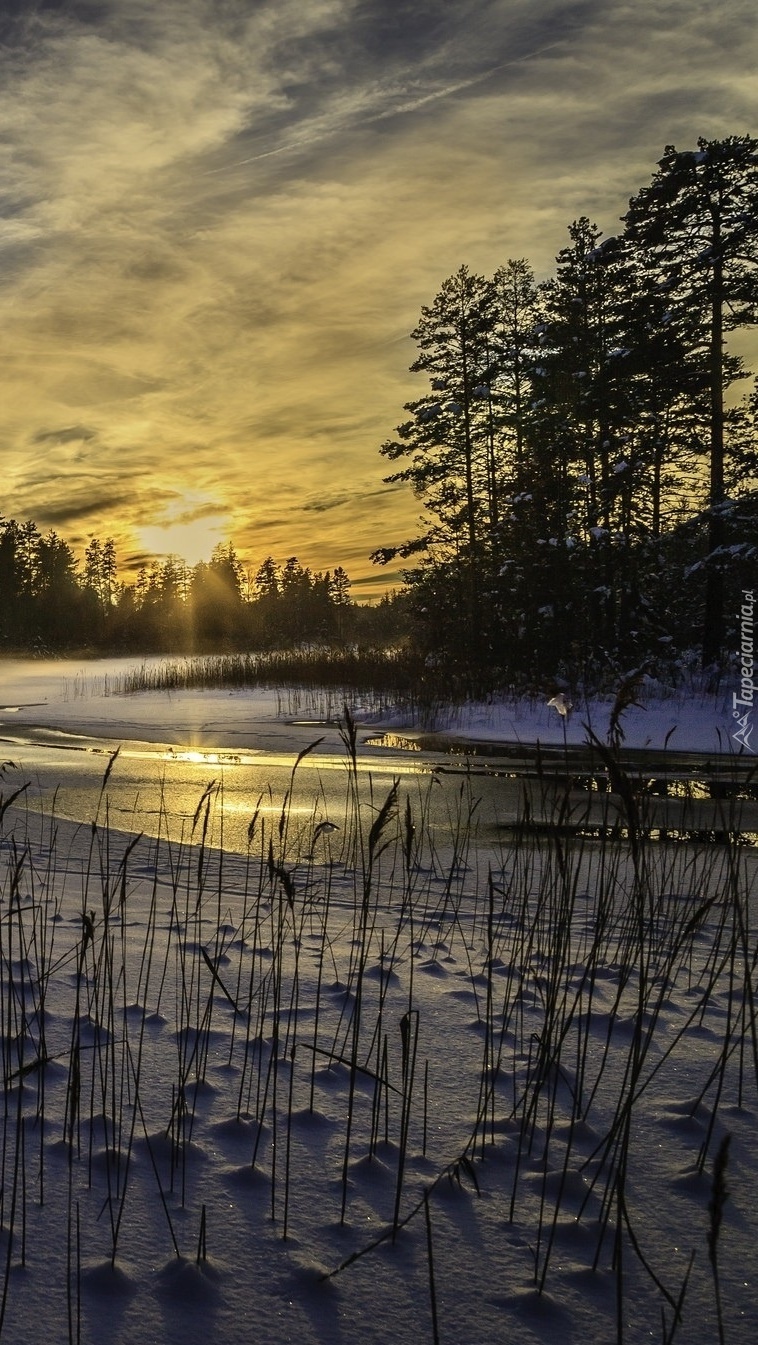 Edytor tapety: Rzeka w zachodzącym słońcu zimą