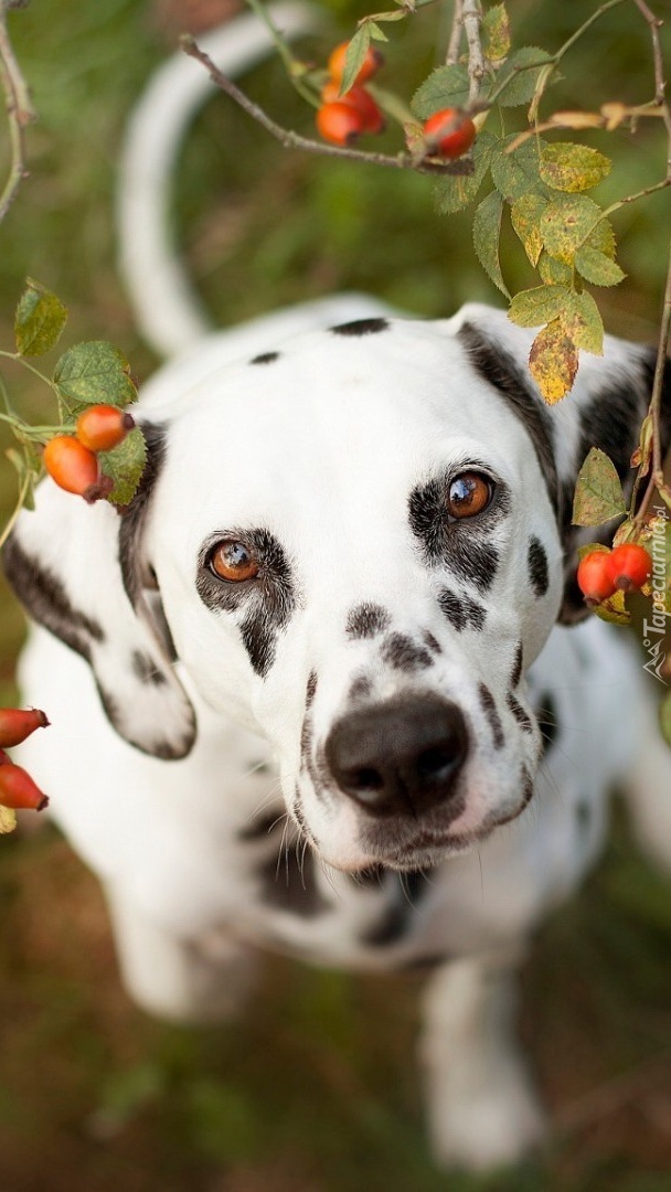 Edytor tapety: Cętkowany piesek pod gałązką dzikiej róży