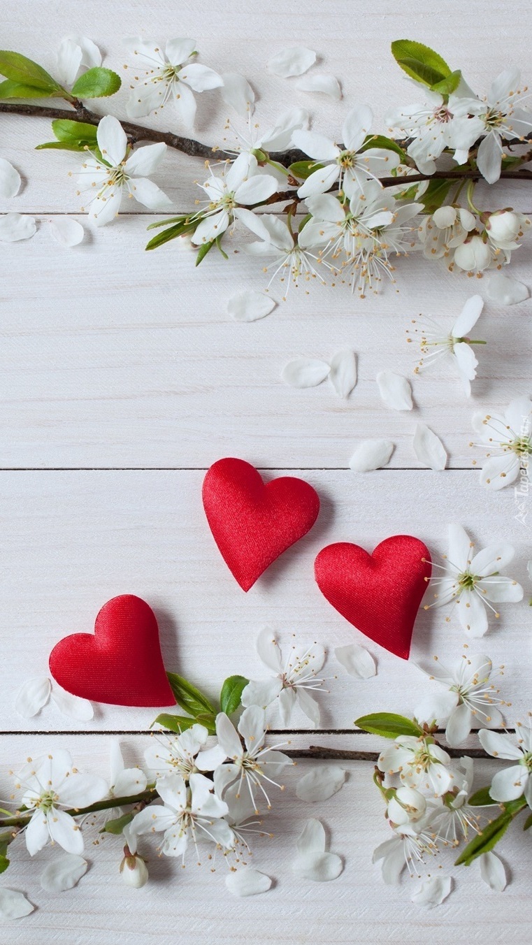 Edytor tapety: Trzy serduszka obok kwitnących gałązek