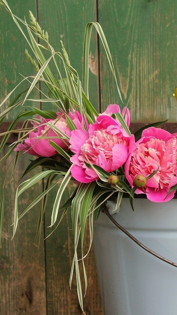 Edytor tapety: Wiadro z różowymi piwoniami