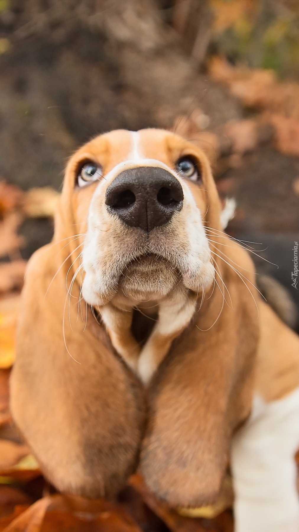 Edytor tapety: Basset hound w liściach