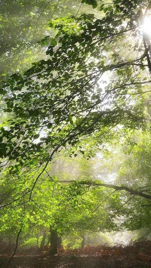 Edytor tapety: Światło przebijające między zielonymi liśćmi drzew