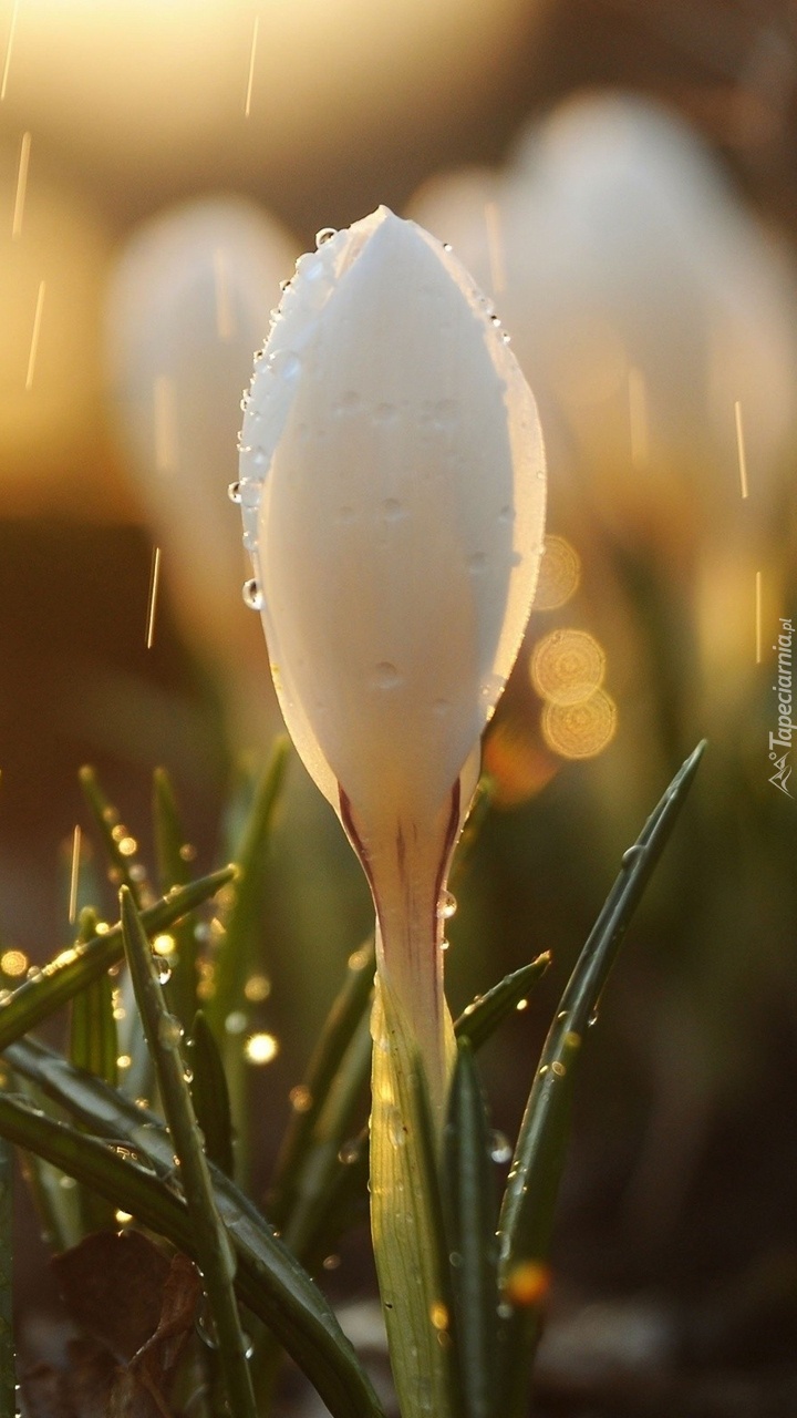 Edytor tapety: Białe krokusy w kroplach deszczu