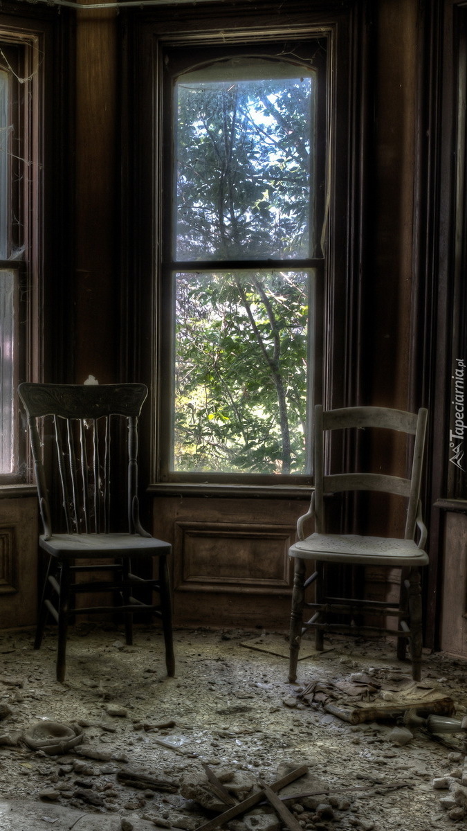 Edytor tapety: Krzesła pod oknem w zaniedbanym pomieszczeniu