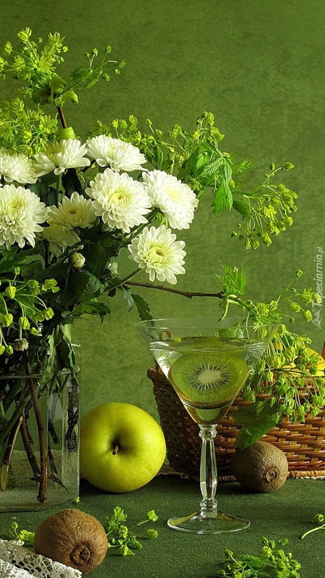 Edytor tapety: Owoce przy wazonie z bukietem chryzantem