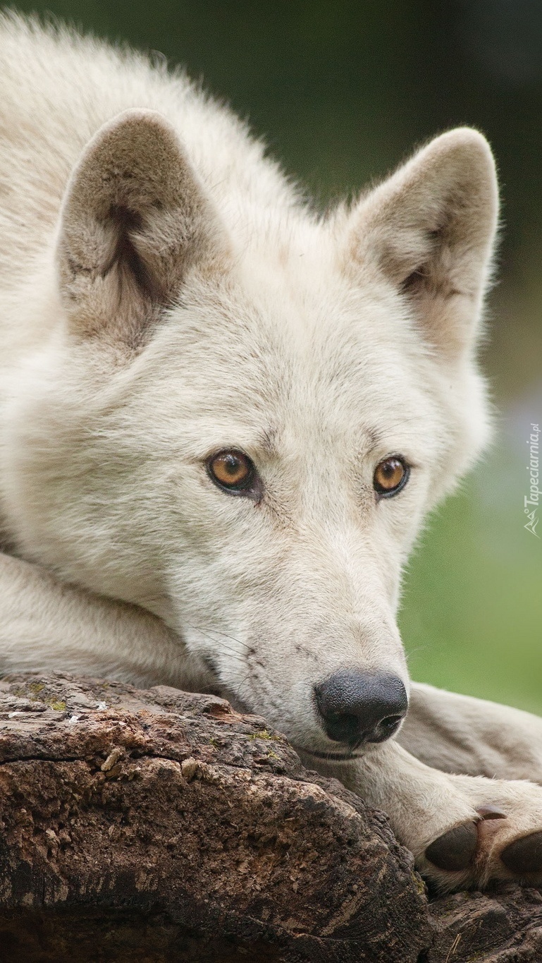 Edytor tapety: Biały wilk leżący na skale