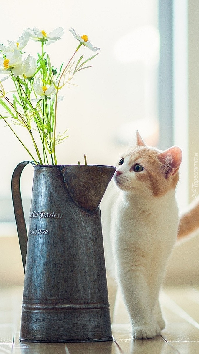 Edytor tapety: Kotek patrzący na dzbanek z kwiatami