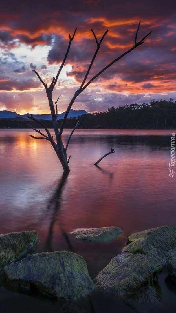Edytor tapety: Drzewo w rzece o zachodzie słońca