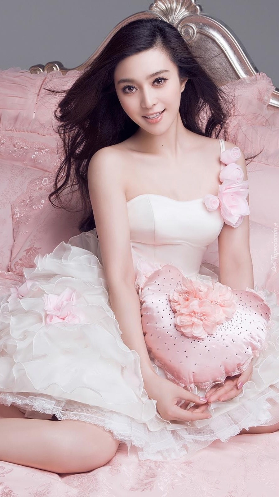 Edytor tapety: Fan Bingbing z różową poduszeczką