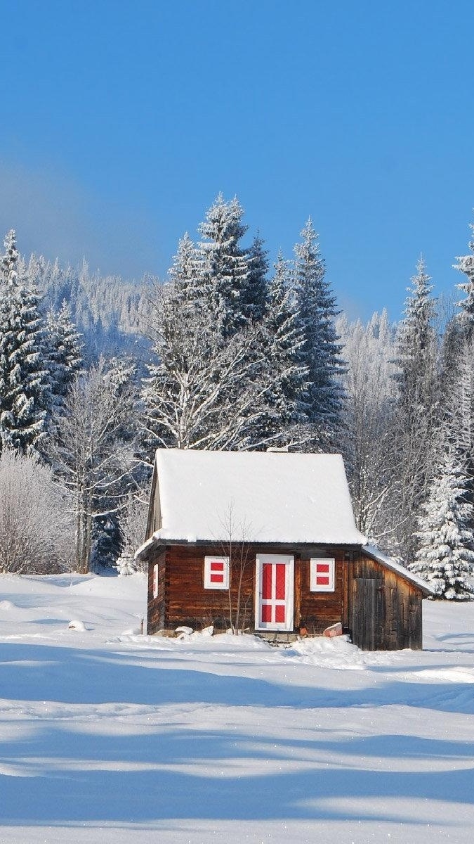 Edytor tapety: Drewniany domek na tle oszronionych drzew