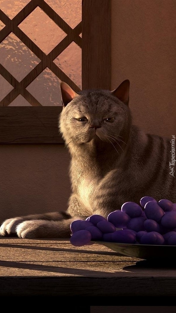 Edytor tapety: Kot przy oknie i winogrona
